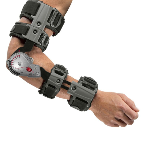Ellenbogenorthese mit einstellbarem Gelenk in Extension und Flexion.